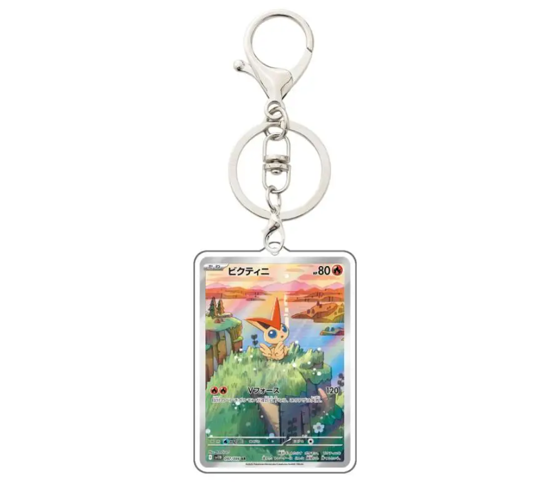Keychain composed of a metal chain holding an acrylic piece with the adhesive of the corresponding card.