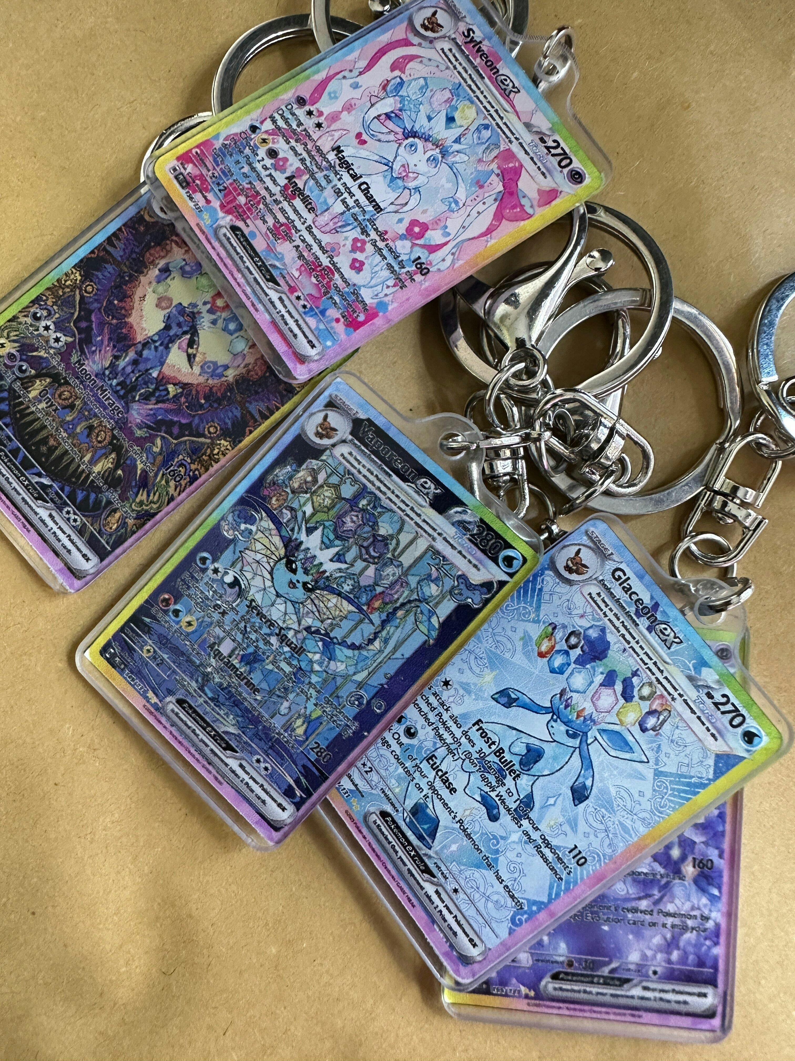 Keychain composed of a metal chain holding an acrylic piece with the adhesive of the corresponding card.